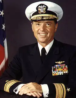 His military awards include two Silver Stars, two Defense Superior Service Medals, two awards of the Legion of Merit, five Distinguished Flying Crosses, twenty-seven Air Medals, five Navy Commendation Medals and service medals for the World War II, Korean and Vietnam conflicts.[3] He flew 50 combat missions in Korea, flying the F4U Corsair from the aircraft carrier USS Princeton, and 250 combat missions in Vietnam as a squadron and air wing commander. In 1967 he became the third naval aviator to achieve 1,000 arrested carrier landings, accomplished without accident over 20 years, flying 11 aircraft types from 15 aircraft carriers.[4]