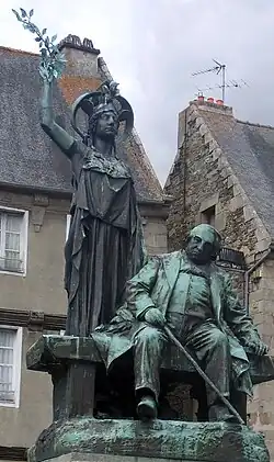 In 1903 a major controversy accompanied the installation of a monument in Tréguier designed by Jean Boucher. Placed in the local cathedral square, it was interpreted as a challenge to Catholicism, and led to widespread protests, especially because the site was normally used for the temporary pulpit erected at the traditional Catholic festival of the Pardon of St Yves. It also included the Greek goddess Athena raising her arm to crown Renan gesturing in apparent challenge towards the cathedral.[39][40] The local clergy organised a protest calvary sculpture designed by Yves Hernot as "a symbol of the triumphant ultramontaine church."