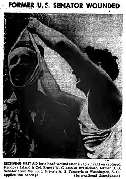 While serving in the Pacific Theater, Gibson was wounded. A newspaper photo showing him having his head bandaged after he was wounded was circulated internationally, along with a caption identifying him as a former Senator, and he gained a measure of fame as a result.[23][24]