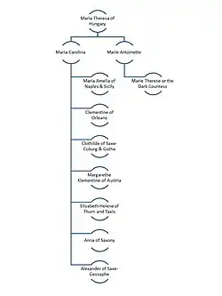 Maternal genealogical lines showing relationship between Marie Therese Charlotte (daughter of Marie Antoinette) and Alexander, Prince of Saxe-Gessaphe.