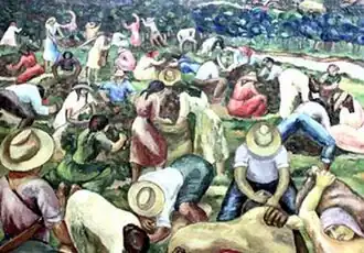 Escogedoras de café (Coffee Pickers) (1939) is a painting by the Ecuadorian social realist artist Alba Calderón. In this tropical-colored painting, peasants are toiling on a coffee plantation overseen by a majordomo with a sheathed machete. The peasants' faces are not shown or are covered by sombreros.