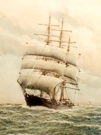 The ship was wrecked in the Solway Firth on 25 November 1888 while carrying a cargo of steel rails from Whitehaven, Cumbria, to Rosario, Argentina. The ship first became stranded on a bank to the north of the Workington Bank; but floating free it later ran aground on the Robin Rigg Sand on which it became embedded. As the position worsened, and the ship filled with water, the crew sought refuge in the rigging and the first mate drowned after being knocked from the mizzen mast.[3] The rest of the crew were rescued by the Maryport lifeboat which landed them safely there.[4][3]
