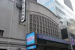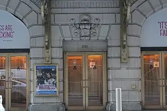 The facade is symmetrically arranged. The ground floor is clad in rusticated blocks of terracotta, painted in a limestone color, above a granite water table. At ground level, the auditorium entrance includes two arched openings, each with four aluminum and glass doors. The voussoirs of the arches are made of rusticated blocks, while the keystones at the centers of each arch are shaped like brackets. Within each arch, the spaces above the doors are infilled with black glazed tiles; originally, these spaces were filled with metal tracery. Between the arched doors is a smaller doorway, which is topped by a large keystone. Above all of these openings is a marquee with the name "Barrymore", which is supported by ornate bronze brackets.[15] The presence of the large marquee obscures the contrast between the ground floor and upper stories.[16] The brackets originally supported a smaller bronze-and-glass canopy, which curved upward in front of either arch.[5][17]