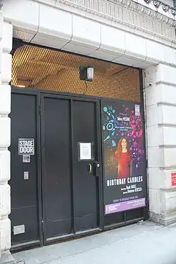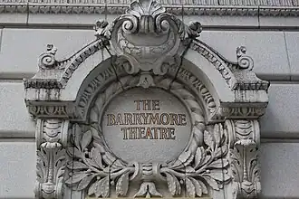 On either side of the doors are terracotta niches with bronze-framed sign boards. Above the signboards are terracotta wreaths, which surround circular panels with the gilded letters "The Barrymore Theater". Each wreath is topped by a curved pediment. The western and eastern portions of the facade are recessed slightly and contain recessed openings.[15] The opening to the east is marked as the stage door.[10][15] A frieze, decorated with leaf and wave moldings, runs above the first floor.[15] To the east, there was originally a stage house with fire escapes on its facade, but this has since been replaced with the Morgan Stanley Building.[17]