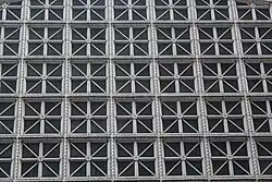 The upper stories are faced in bonded glazed-white brick.[15][17][18] The central part of the facade includes a terracotta screen with an Ancient Roman-inspired pattern, surrounded by a cord molding. The screen includes a grid of squares, each of which contain central medallions with bars radiating in eight directions. To the left of the screen, the wall contains a sign with the name "Barrymore" and a metal fire escape. A metal sign hangs from the facade to the right. The top of the screen curves upward in a manner resembling a proscenium arch, and a brick parapet rises above the screen. A Greek key frieze and a cornice with talon moldings runs above the entire facade.[15] Contemporary media from the theater's opening cited the top of the facade as being 62 ft (19 m) above the sidewalk, while the screen was 52 ft (16 m) wide.[6][18]