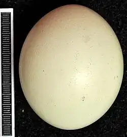 The eggs are normally laid at intervals of three days and are incubated only by the female. Laying generally begins in late winter but may be later in the year in colder habitats. During the incubation period, the female is brought food at the nest by her mate.[22] A single clutch of white eggs is laid; each egg can measure from 56 to 73 mm (2.2 to 2.9 in) long by 44.2 to 53 mm (1.74 to 2.09 in) in width, and will usually weigh about 75 to 80 g (2.6 to 2.8 oz).[19][22][111] In Central Europe, eggs average 59.8 mm × 49.5 mm (2.35 in × 1.95 in), and in Siberia, eggs average 59.4 mm × 50.1 mm (2.34 in × 1.97 in). Their eggs are only slightly larger than those of snowy owls and the nominate subspecies of great horned owl, while similar in size to those of spot-bellied eagle-owls and Blakiston's fish owls. The Eurasian eagle-owl's eggs are noticeably larger than those of Indian eagle-owl and pharaoh eagle-owls.[8][19] Usually clutch size is one or two, rarely three or four, and exceptionally to six.[8][22] The average number of eggs laid varies with latitude in Europe. Clutch size ranges from 2.02 to 2.14 in Spain and the massifs of France, and 1.82 to 1.89 in central Europe and the eastern Alps; in Sweden and Finland, the mean clutch size is 1.56 and 1.87, respectively. While variation based on climate is not unusual for different wide-ranging palearctic species, the higher clutch size of western Mediterranean eagle-owls is also probably driven by the presence of lagomorphs in the diet, which provide high nutritional value than most other regular prey.[112] The average clutch size, attributed as 2.7, was the lowest of any European owl per one study. One species was attributed with an even lower clutch size in North America, the great grey owl with a mean of 2.6, but the mean clutch size was much higher for the same species in Europe, at 4.05.[111]