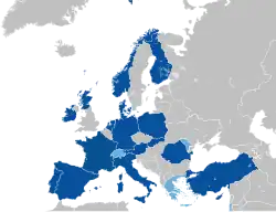 Countries with a member orchestra in EFNYO (associated members in light blue; overseas members not shown)