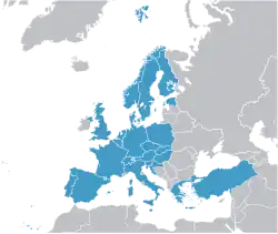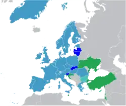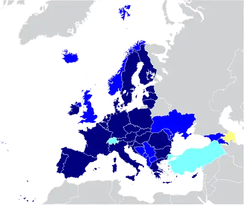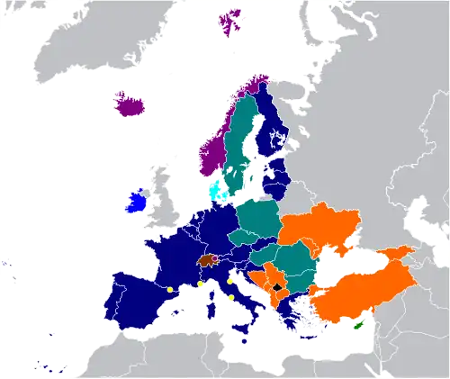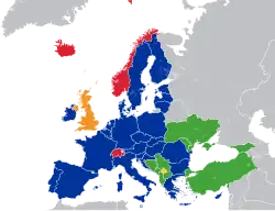The following table shows the status of each state membership to the different agreements promoted by the EU. It lists 47 countries, including the 27 EU member states, 9 candidate states, 3 members of the EEA and Switzerland, Kosovo which has applied for membership, 4 microstates, and the United Kingdom and Armenia as special cases.