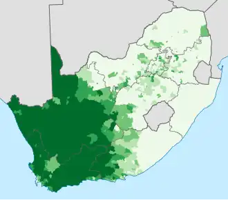 The size of the Afrikaner population in South Africa was estimated at 2.5 million people in 1985.[60] According to the country's 2011 census, there were about 2.7 million white South Africans who spoke Afrikaans as a first language, or slightly over 5% of the total population.[61]