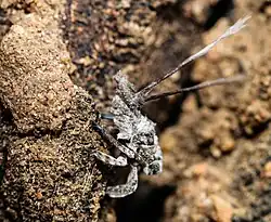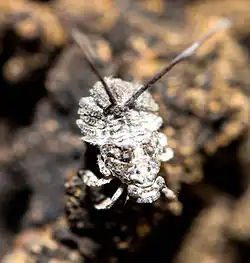 The nymphs, being less agile than the adults, rely on mimicry, camouflage for direct protection. However, they also secrete honeydew, a sugary excretion, that attracts ants.[5] The ants in turn protect them from wide varieties of predators and parasitoids.