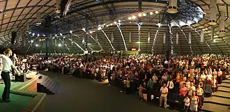 For evangelicals, there are three interrelated meanings to the term worship. It can refer to living a "God-pleasing and God-focused way of life," specific actions of praise to God, and a public worship service.[53] Diversity characterizes evangelical worship practices. Liturgical, contemporary, charismatic and seeker-sensitive worship styles can all be found among evangelical churches. Overall, evangelicals tend to be more flexible and experimental with worship practices than mainline Protestant churches.[54] It is usually run by a Christian pastor. A service is often divided into several parts, including congregational singing, a sermon, intercessory prayer, and other ministry.[55][56][57][58] During worship there is usually a nursery for babies.[59] Children and young people receive an adapted education, Sunday school, in a separate room.[60]