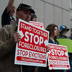 Eviction in the United States refers to the pattern of tenant removal by landlords in the United States.[1] In an eviction process, landlords forcibly remove tenants from their place of residence and reclaim the property.[2] Landlords may decide to evict tenants who have failed to pay rent, violated lease terms, or possess an expired lease.[1] Landlords may also choose not to renew a tenant's lease, however, this does not constitute an eviction.[2] In the United States, eviction procedures, landlord rights, and tenant protections vary by state and locality.[2] Historically, the United States has seen changes in domestic eviction rates during periods of major socio-political and economic turmoil—including the Great Depression, the 2008 Recession, and the COVID-19 pandemic. High eviction rates are driven by affordable housing shortages and rising housing costs.[3] Across the United States, low-income and disadvantaged neighborhoods have disproportionately higher eviction rates.[4] Certain demographics—including low income renters, Black and Hispanic renters, women, and people with children—are also at a greater risk of eviction.[4] Additionally, eviction filings remain on renters' public records. This can make it more difficult for renters to access future housing, since most landlords will not rent to a tenant with a history of eviction.[1] Eviction and housing instability are also linked to many negative health and life outcomes, including homelessness, poverty, and poor mental and physical health.