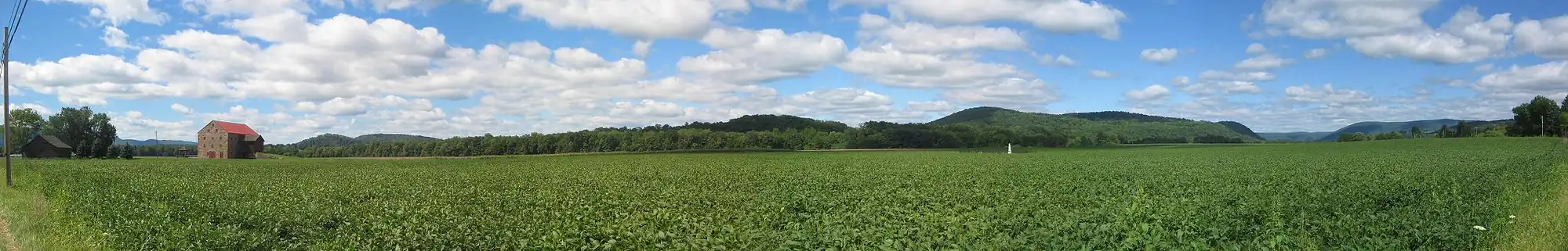 Panoramic view of Fairfield Township taken from Pennsylvania Route 87. The left side is south, with Bald Eagle Mountain visible on the horizon behind the old barn. There is an early cemetery in the middle of the field. The right side is north, with the opening of the Loyalsock Creek valley visible in the dissected Allegheny Plateau. This view is approximately 180 degrees.