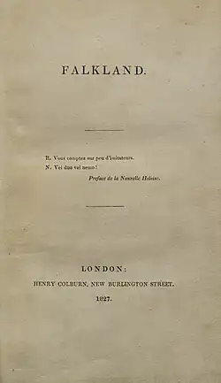 Falkland is an 1827 Gothic novella by the British writer Edward Bulwer-Lytton.[1][2] It was his first published novel and took inspiration from Johann Wolfgang von Goethe's The Sorrows of Young Werther.[3] The protagonist was likely partly based on Bulwer-Lytton himself. The novel enjoyed success in Germany, but was criticised in Britain as immoral.[4] It was followed by Pelham in 1828, in which he switched to the fashionable silver fork genre, which established him as a leading writer in Britain and Europe.