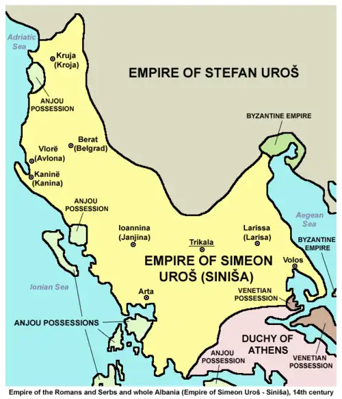Dušan's half-brother Simeon Uroš was expelled from Epirus and sought to obtain Serbia. He marched on Serbia in 1357 after he had himself proclaimed Tsar of the Greeks, Serbs, and Albanians at Kastoria in 1356. The forces of Stephen Uroš met the forces of Simeon near Scutari in Zeta and forced them to back down. Meanwhile, in the Serbian, Bulgarian and Byzantine borderlands of western Thrace, Matthew Kantakouzenos, the son of the Byzantine emperor John VI Kantakouzenos made war on the Serbs in 1356-57 but failed to capture Serres with his five-thousand Turks and was soon defeated in battle by Vojvoda Vojin and held for ransom. The ransom was paid by the Emperor John V Palaiologos and Matthew was allowed to retire to Morea. Now the lands that remained loyal to Uroš were most of Macedonia, including the land between the Struma and Mesta rivers and the Chalcidice peninsula. The lands that remained Serbian could be divided into three main parts: the western territories, including Zeta, the central Serbian lands of Uroš and the southern lands (including the eastern part of Macedonia with Serres as its capital).
