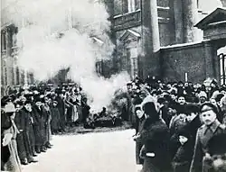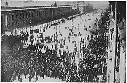 On 23 February O.S. (8 March N.S.), Putilov protesters were joined in the uprising by those celebrating International Women's Day and protesting against the government's food rationing.[40] As the Russian government began rationing flour and bread, rumors of food shortages circulated and bread riots erupted across the city of Petrograd.[40] Women, in particular, were passionate in showing their dissatisfaction with the rationing system, and the female workers marched to nearby factories to recruit over 50,000 workers for the strikes.[41] Both men and women flooded the streets of Petrograd, demanding an end to Russian food shortages, the end of World War I, and the end of autocracy.[38] By the following day 24 February O.S. (9 March N.S), nearly 200,000 protesters filled the streets, demanding the replacement of the Tsar with a more progressive political leader.[38] They called for the war to end and for the Russian monarchy to be overthrown.[40] By 25 February O.S (10 March N.S), nearly all industrial enterprises in Petrograd were shut down by the uprising.[7] Although all gatherings on the streets were absolutely forbidden some 250,000 people were on strike. The president of the Imperial Duma Rodzianko asked the chairman of the Council of Ministers Golitsyn to resign; the minister of Foreign Affairs Nikolai Pokrovsky proposed the resignation of the whole government. There were disturbances on the Nevsky Prospect during the day.[42]