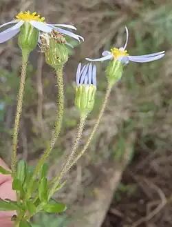 The flower heads sit individually on the clearly distinguished inflorescence stalks that are mostly richly glandular near the top. The bracts surrounding the head that jointly form the involucre of up to 8 mm (13 in) in diameter, are arranged in two whorls. The bracts of the inner whorl are Inverted lance-shaped, about 5 mm (0.20 in) long and 1 mm (0.039 in) wide, ribbed, and a little bristly. The outer bracts are lance-shaped, about 6 mm (0.24 in) long and 1 mm wide, with three sunken resin ducts, and consistent with the indumentum of the leaves, variously bristly hairy or also glandular. About twelve to fourteen female ray florets have a blue strap of ligula of about 11 mm (0.43 in) long and 1½ mm (0.06 in) wide, blue. These surround many bisexual, disc florets with a yellow corolla of about 4 mm (0.16 in) long. In the center of each corolla are five free filaments and five anthers merged into a tube, through which the style grows when the floret opens, hoovering up the pollen on its shaft. At the tip of both style branches is a triangular appendage. Around the base of the corolla is one whorl of vigorous, equally long, white, shortly toothed, but smooth at their base, largely persistent pappus bristles of about 4 mm (0.16 in) long. The eventually black, dry, one-seeded, indehiscent fruits called cypselae are inverted egg-shaped to elliptic, about 3 mm (0.12 in) long and 1½ mm (0.06 in) wide, have a ridge along the outline, are hairless or rarely have a few bristles near the top, and a further smooth seedskin.[2]