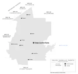 Felipe Carrillo Puerto (or simply Carrillo Puerto) is a municipality in the south-central part of the Mexican state of Quintana Roo. The municipal seat is the city of the same name. It was named after the assassinated local politician Felipe Carrillo Puerto. According to the 2009, 2019 census, the municipality's population was 83,990 inhabitants, living on an area of 13,806 square kilometres (5,331 sq mi).[2]