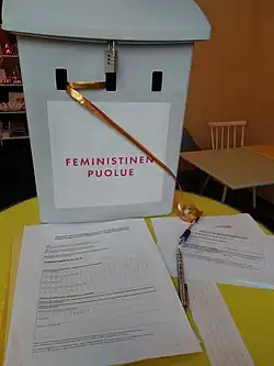 The Feminist Party (Finnish: Feministinen puolue, Swedish: Feministiska partiet) is a Finnish feminist political party. It was founded in June 2016,[3] and registered as a political party in January 2017.[4] It calls gender equality, human rights, and human security the primary pillars of its politics.[5]