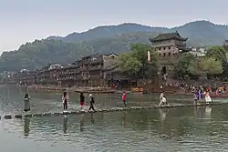 Fenghuang County has an exceptionally well-preserved ancient town that harbours unique ethnic languages, customs, arts as well as many distinctive architectural remains of Ming and Qing styles. The town is placed in a mountain setting, incorporating the natural flow of the river Tuojiang into the city layout.[6] Over half of the city's population belong to the Miao or Tujia minorities.[7] It was the centre of the unsuccessful Miao Rebellion of 1854-73, which created a Miao diaspora in Southeast Asia during the last two centuries. The city is revered in Miao traditions and funeral rites and is the location of the Southern China Great Wall (中国南方长城; 中國南方長城; Zhōngguó Nánfāng Chángchéng; Miao: "Suav Tuam Choj"),[8] a fortification built by the Ming dynasty to protect the local Han Chinese from Miao attacks.