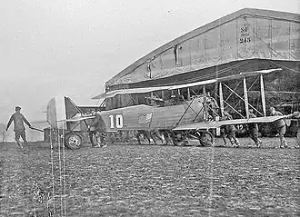 ![]() Salmson 2A2 of the 1st Aero Squadron being pushed by maintenance personnel, Summer 1918. | |