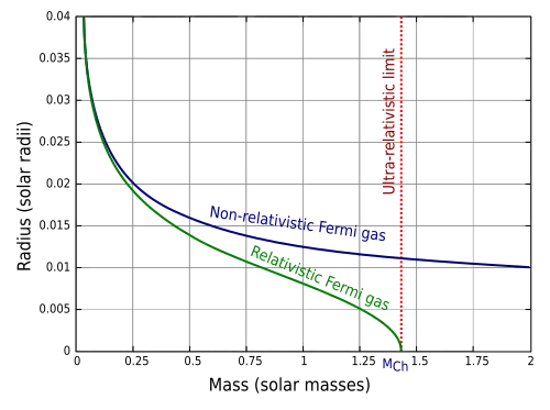 Radius–mass relations for a model white dwarf, relativistic relation vs non-relativistic. The Chandrasekhar limit is indicated as MCh.