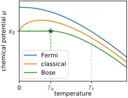 Chemical potential vs temperature curves of classical and quantum ideal gases (Fermi gas, Bose gas) in three dimensions.