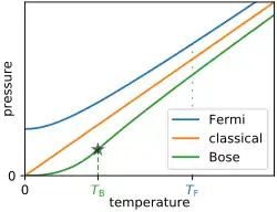 Pressure vs temperature curves of classical and quantum ideal gases (Fermi gas, Bose gas) in three dimensions. Pauli repulsion in fermions (such as electrons) gives them an additional pressure over an equivalent classical gas, most significantly at low temperature.