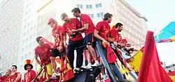 Torres was called up for Spain's Euro 2008 squad,[167] where he set up Villa to score Spain's first goal of the tournament in the first game in the group stage against Russia.[168] Torres came under criticism for apparently refusing to shake the hand of Spanish manager Luis Aragonés after being substituted off.[169] He subsequently denied being angry with the coaching, saying that he was actually "irritated with himself".[169] He scored his first goal of the tournament in Spain's next game, a 2–1 win over Sweden.[170] Torres scored the winner and was named the man of the match in the final against Germany in a 1–0 victory.[171][172] He said, "It's just a dream come true. This is my first title and I hope it's the first of many. Victory in a Euro, it is almost as big as a World Cup. We are used to watching finals on television, but today we were here and we won. My job is to score goals. I want to win more titles and be the most important player in Europe and the world."[173] He was later named as a striker along with his striking partner David Villa in the Team of the Tournament.[174]