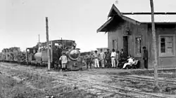Unidentified station with a freight train stopped at it (1914).