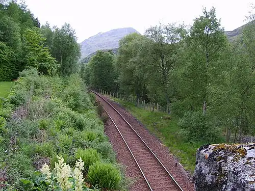 The West Highland Railway opened the line to passengers on 7 August 1894; later it was operated by the North British Railway, until in 1923 it became part of the London and North Eastern Railway. In 1948 the line became part of the Scottish Region of British Railways following nationalisation. Fersit Halt however was opened to serve the navvy encampment and the construction depot for the Lochaber Power Scheme that involved extensive works building dams at Loch Treig and Loch Laggan.[3] A diversion of the original West Highland Railway line route was necessary over a distance of [4] 1.5 miles, the original trackbed is visible beneath the Loch Treig dam.[5]