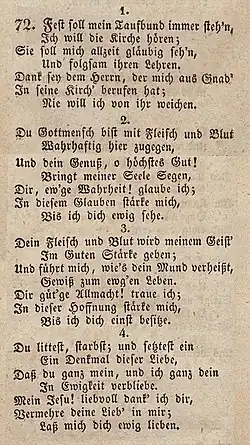 The text of "Fest soll mein Taufbund immer steh'n" was written, originally in four stanzas, by Friedrich Matthias Berghaus, a Catholic priest in Münster. Christoph Bernhard Verspoell, also a priest there, included it in his hymnal Gesänge beim Römischkatholischen Gottesdienste nebst angehängtem Gebetbuche in 1810, with another edition in 1828.[1] The melody was written later by Chrysanth Joseph Bierbaum (1789–1868), a vicar at St. Remigius in Bonn, where it was published in 1826.[2]