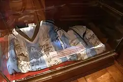Argentine uniform signed by the gold medalist exhibited at the Argentine Olympic Committee museum.