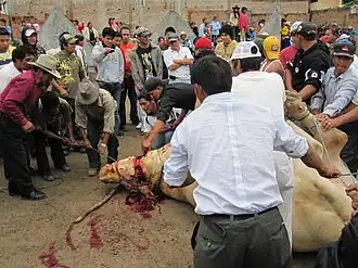 The highlight of the festival are the corridas (runnings of the bulls) held each Saturday. Bulls are brought into a plaza and released, so that they can be chased and brought back to the plaza. Young people re-capture the animals, often by pulling on their tails, and bring the animals back to the plaza. Upon the bulls' return, one or more of the bulls is killed as a sacrifice. Dozens of participants surround the bull and take turns drinking the blood that flows from it as it dies. It is commonly believed that the blood is good for the health. After the drinking of the blood, the bull is cleaned and prepared for being served in later festivities.[4]