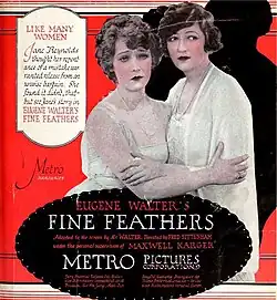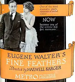 Fine Feathers is a 1921 American silent drama film directed by Fred Sittenham and starring Eugene Pallette, Claire Whitney, Thomas W. Ross, Warburton Gamble and June Elvidge, produced and distributed by Metro Pictures Corporation. The library of Congress shows a release date of June 20, 1921[1] but there is evidence that Fine Feathers was being screened on June 18 at the Rose Theater[2] in Santa Rosa California and as early as June 17 at the Star Theater in Monterey California.[3] This production is the second movie adaptation of Eugene Walter's 1912 play of the same name. Three complete 35 mm copies were donated by M.G.M. to the U.S. Archive.[1] A nitrate picture negative, an acetate positive print and an acetate fine grain master, all kept at the Eastman Museum in Rochester, NY.[4]