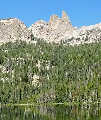 Finger of Fate is a distinctive landmark and rock-climbing destination in the Sawtooth Range which is a subrange of the Rocky Mountains.[1][5] It is situated 13 miles (21 km) south of Stanley, Idaho, in the Sawtooth Wilderness on land managed by Sawtooth National Forest.[5] The spire can be seen from Highway 75 at Galena Summit as travelers approach Sawtooth Valley.[6] Precipitation runoff from the mountain drains to Hell Roaring Lake, thence the Salmon River via Hell Roaring Creek. Topographic relief is significant as the summit rises nearly 2,400 feet (732 meters) above the lake in one mile (1.6 km). The first ascent of the summit was made in 1958 by Louis Stur and Jerry Fuller via The Open Book (class 5.8).[1] A 6.5 magnitude earthquake in 2020 dislodged the summit boulder from the top of the pillar.[1] This landform's descriptive toponym has been officially adopted by the United States Board on Geographic Names.[3]