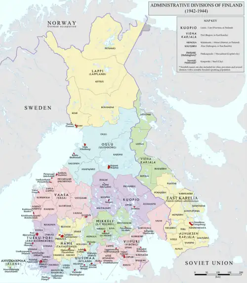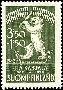 The Continuation War and belief in a quick German victory over the Soviet Union once again gave rise to Finnish irredentism.[2] The legality of the Finnish claims on Eastern Karelia was justified by both ethno-cultural and military security factors.[2] During the spring of 1941, when the Finnish political leadership understood the full extent of the German plans concerning the Soviet Union, president Ryti commissioned professor of geography Väinö Auer and historian Eino Jutikkala to demonstrate "scholarly" that Eastern Karelia formed a natural part of the Finnish living space.[3] The resulting book Finnlands Lebensraum ("Finland's Living Space") was published in the autumn of 1941, and was intended to legitimize Finnish claims and actions to the international audience.[3] A similar book by historian Jalmari Jaakkola, Die Ostfrage Finnlands ("Finland's Eastern Question") was published in the summer of the same year.[4]
