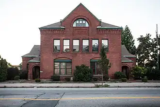 Fire Station Number 4, also known as the Collyer Fire Station, (see building plaque) [2] was constructed in 1887-1888 by H. L. Bassett & Co. and F. L. Mason on the southwest corner of Broadway and Carnation Street, in the center of Pleasant View neighborhood. The building was completed and named in 1890. The main block of the Queen Anne-styled red brick firehouse is a 2+12-story, hip-roofed rectangle with a cross-gable facing Broadway. A pair of matching single-story wings with gable-on-hipped roofs project from the long sides of the building. The building has small hip-roofed porches with arched openings on the main entrance and Broadway facing sides. Though constructed of red brick and pinkish mortar, sandstone was used for the window sills and lintels and the station's trim. The building has detailed terracotta work, with an ornate foliate name and date plaque on the front gable and a string course at the base of the corbeled main entrance. Above the plaque is a semi-circular window, and another round-headed window is on the northern side. The northwest corner has a square hose drying/bell tower that also has its own round headed window. Photos of the building are available here.[2] The station has been modified; its two fire engine doors have been removed and replaced with modern garage doors. The pyramidal roof on the belfry which crowned the bell tower was "recently" removed at the time of its NRHP nomination in 1983.[3] The interior of the firehouse has been greatly altered in the conversion to office and meeting room space by the time of its National Register of Historic Places nomination. The surviving details included the Queen Anne staircase and sunken panel doors. Though the interior has been greatly modified, it did not prevent its being listed on the historic register.[3]