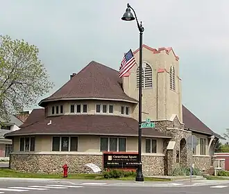 It is described as "Gothic Revival inspired" and as "Craftsman influenced". It is a one-story church on a 40 by 78 feet (12 m × 24 m) plan, with a square bell tower over its main entrance, and with an unusual polygonal rotunda at its west end. The rotunda area provided space for six separable classroom spaces, consistent with Akron Plan design.[2]
