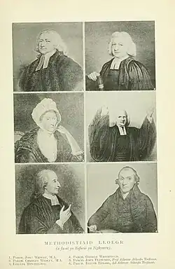 Methodist leaders active in the Evangelical Revival (clockwise): John Wesley, Charles Wesley, George Whitefield, Joseph Benson, John Fletcher and the Countess of Huntingdon (1895 Welsh illustration)