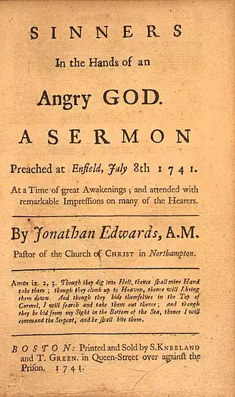 Conviction of sin was the stage that prepared someone to receive salvation, and this stage often lasted weeks or months.[73] When under conviction, nonbelievers realized they were guilty of sin and under divine condemnation and subsequently faced feelings of sorrow and anguish.[74] When revivalists preached, they emphasized God's moral law to highlight the holiness of God and to spark conviction in the unconverted.[75] Jonathan Edwards' sermon "Sinners in the Hands of an Angry God" is an example of such preaching.