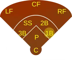A first baseman, abbreviated 1B, is the player on a baseball or softball team who fields the area nearest first base, the first of four bases a baserunner must touch in succession to score a run. The first baseman is responsible for the majority of plays made at that base. In the numbering system used to record defensive plays, the first baseman is assigned the number 3.