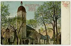 The original First Presbyterian Church of Stamford was a wooden structure located at 90 Broad Street from 1854 to 1882 when it burned down.[4] It was replaced with a stone edifice, enlarged in 1920, which was used until 1958. In 1954, the congregation voted to relocate to its present location at 1101 Bedford Street.