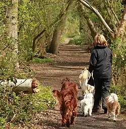 A broader variety of fauna live within the wood, including wood mice, bank and short-tailed voles, common and pygmy shrews, and weasels as well as foxes, rabbits and grey squirrels, and, more rarely, pipistrelle bats.[17] Bird life is also abundant and includes lesser and greater spotted and green woodpeckers, tree-creeper and redwings during winter, while mallards, moorhens and occasionally mandarin ducks have bred nearby.[18]