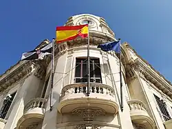 The gyronny field is identical to that of the flag of Lisbon, to commemorate the fact that the flag was the first to be raised in Ceuta by the Portuguese when they conquered the city in 1415.[1] The city was a part of the Portuguese Empire until the end of the Iberian Union in 1640, after which it decided to remain with Spain.[2] Thus the coat of arms of the city is nearly identical to that of the Kingdom of Portugal, showing the seven castles over the red bordure and the five escutcheons with silver roundels.[3]
