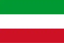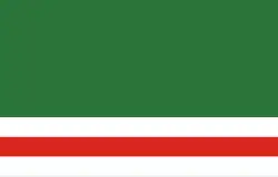 The flag of Chechnya (Chechen: Нохчийчоьнан байракх, romanized: Noxçiyçönan bayraq) is a rectangle with sides in the ratio 2:3 representing the Chechen Republic, a republic of Russia. The flag is composed of three horizontal bars of, from top to bottom: green, representing Islam; white; and red; superimposed on them is a narrow vertical white band at the hoist, containing the national ornament, a design of four golden scroll shapes.