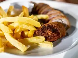 The flamenquín is a traditional dish from Cordoba (Andalusia) made with slices of jamón serrano wrapped in pieces of pork loin, coated breadcrumb batter, and deep-fried. It is often garnished with French fries and mayonnaise. A common variation replaces the loin with boiled ham. It can also be made with other fillings, such as fish, cheese, or poultry.