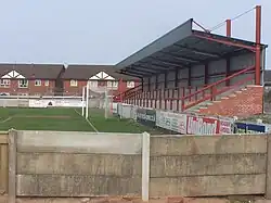 The second phase development, the construction of a new East Stand, to bring the ground capacity over the 4,000 minimum required for Conference National football, was originally scheduled for the 2009 close season, but was postponed, and a £125,000 project to relay the pitch and improve drainage was instead implemented.[52] Plans for the stand were revised and resubmitted in December 2009, and approved in March 2010. The capacity was increased to 2,000, increasing the overall ground capacity to over 5,000 and meeting the requirements of Football League membership. The stand had a proposed cost of £4,000,000.[53] Construction began in May 2010, ahead of Fleetwood's successful Conference North play-off final against Alfreton Town. The stand, now named the Parkside Stand, was completed in the spring of 2011, and fully opened on 16 April for Fleetwood's game against Altrincham, which they won 3–1.