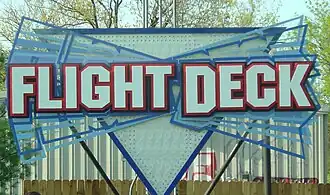Cedar Fair purchased Kings Island in 2006, and in 2008, decided to rename the ride Flight Deck. All references to the film, including theme music playing in the queue and signage, were modified or removed. Cedar Fair had rights to continue using Paramount themes throughout the park for years to come, but they decided to make the transition sooner and begin removing them in 2008.[7] On the 33rd anniversary of The Bat, which operated at Kings Island from 1981 to 1983, the park announced that Flight Deck would take on the same name as the historical Arrow ride and be renamed The Bat for the 2014 season.[8] The ride was repainted a new orange color scheme with charcoal supports and black trains.[9]