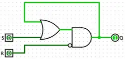 An SR AND-OR latch. Light green means logical '1' and dark green means logical '0'. The latch is currently in hold mode (no change).
